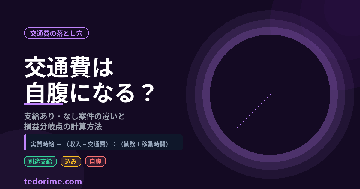 時給が高くても、往復交通費と移動時間を引くと実質時給が大きく下がります。「支給なし」案件は必ずテドリメで実質時給を計算してから判断するのが鉄則です。往復1,000円・移動1時間の現場は、見かけより200〜300円/h低くなることがほとんどです。